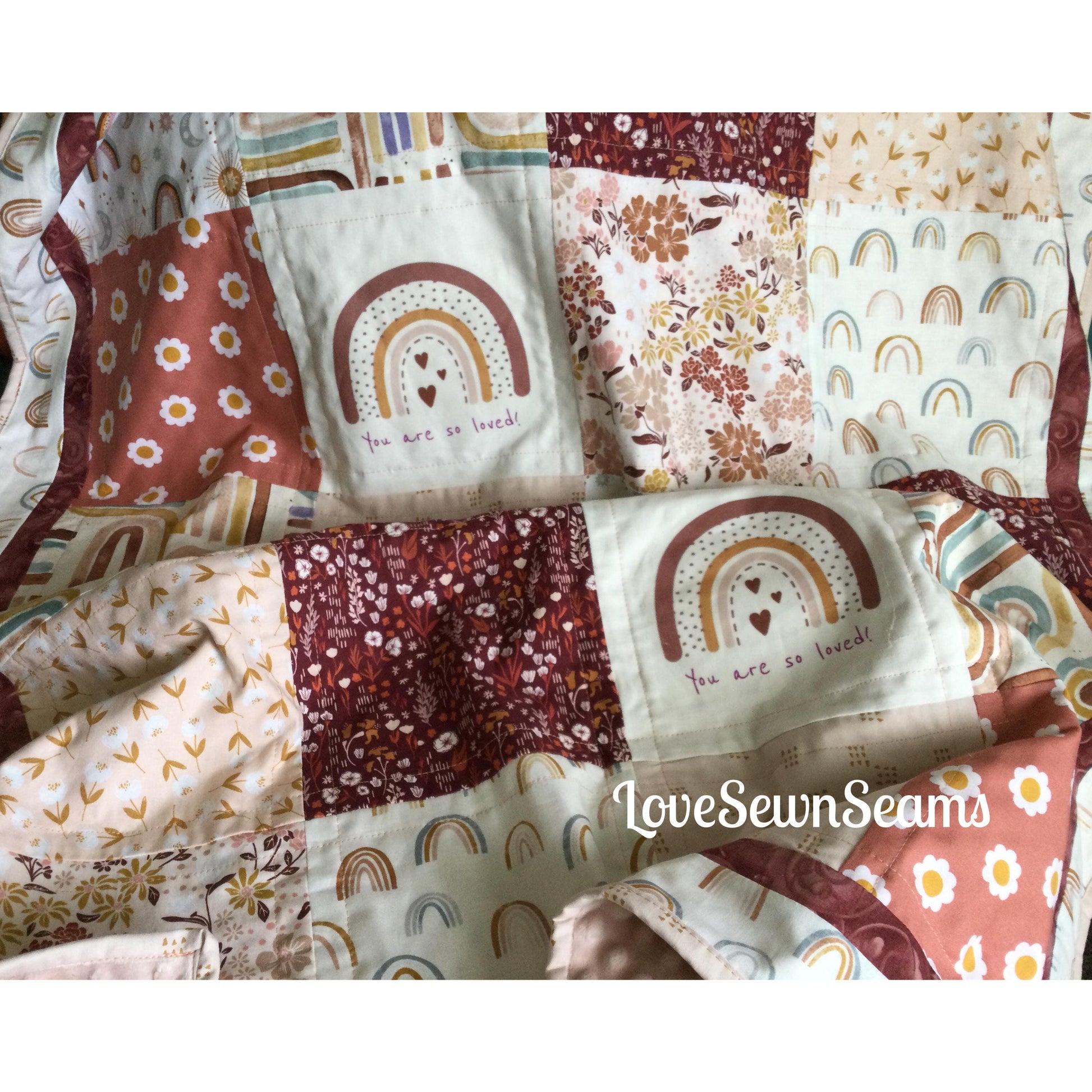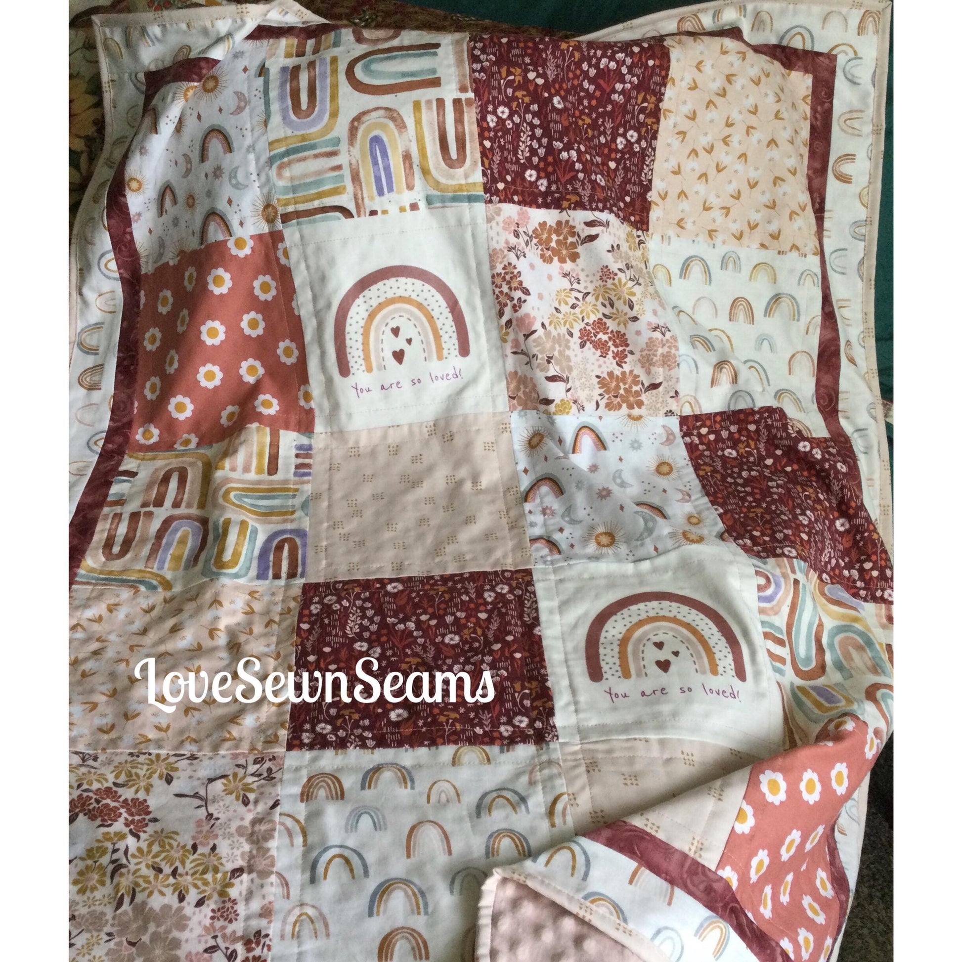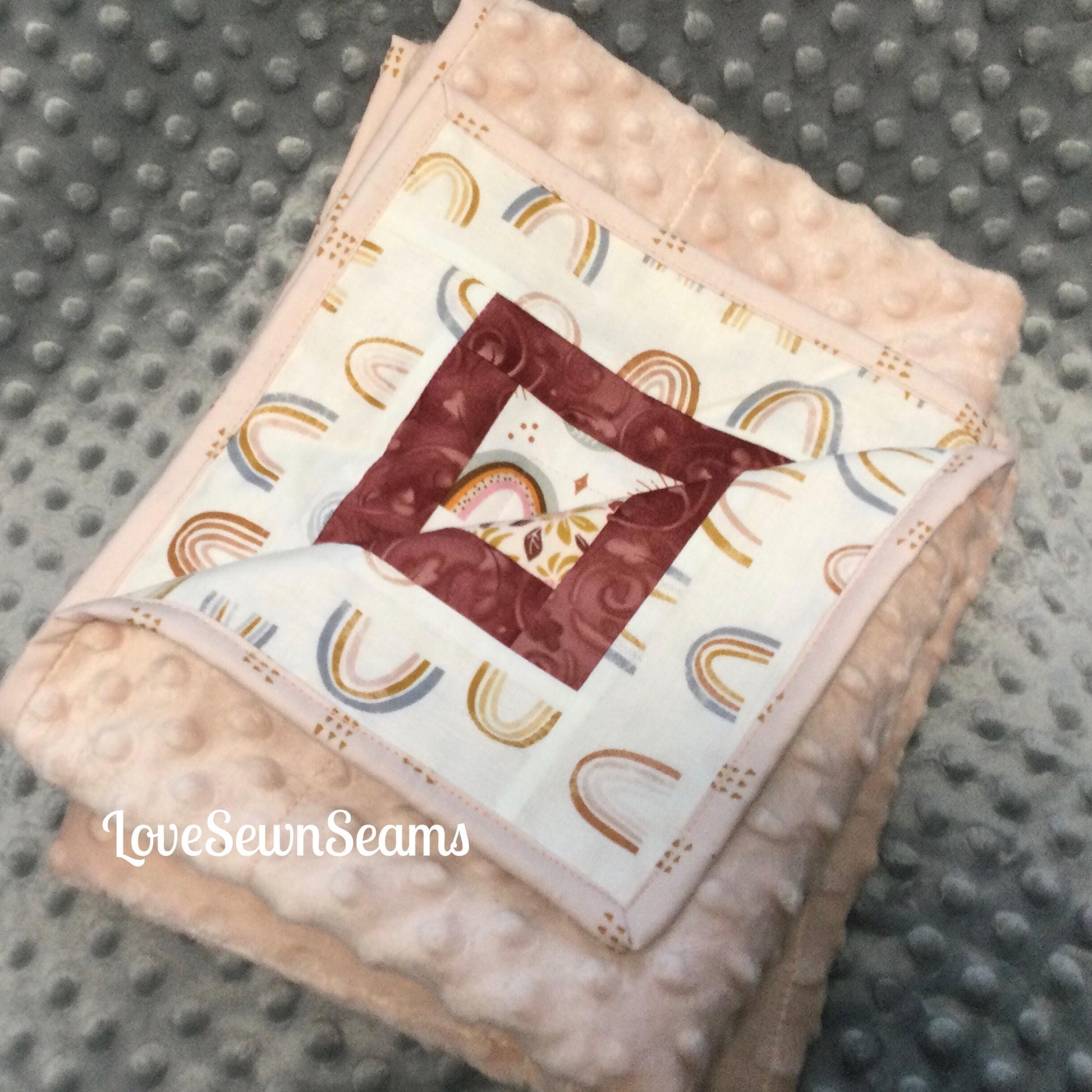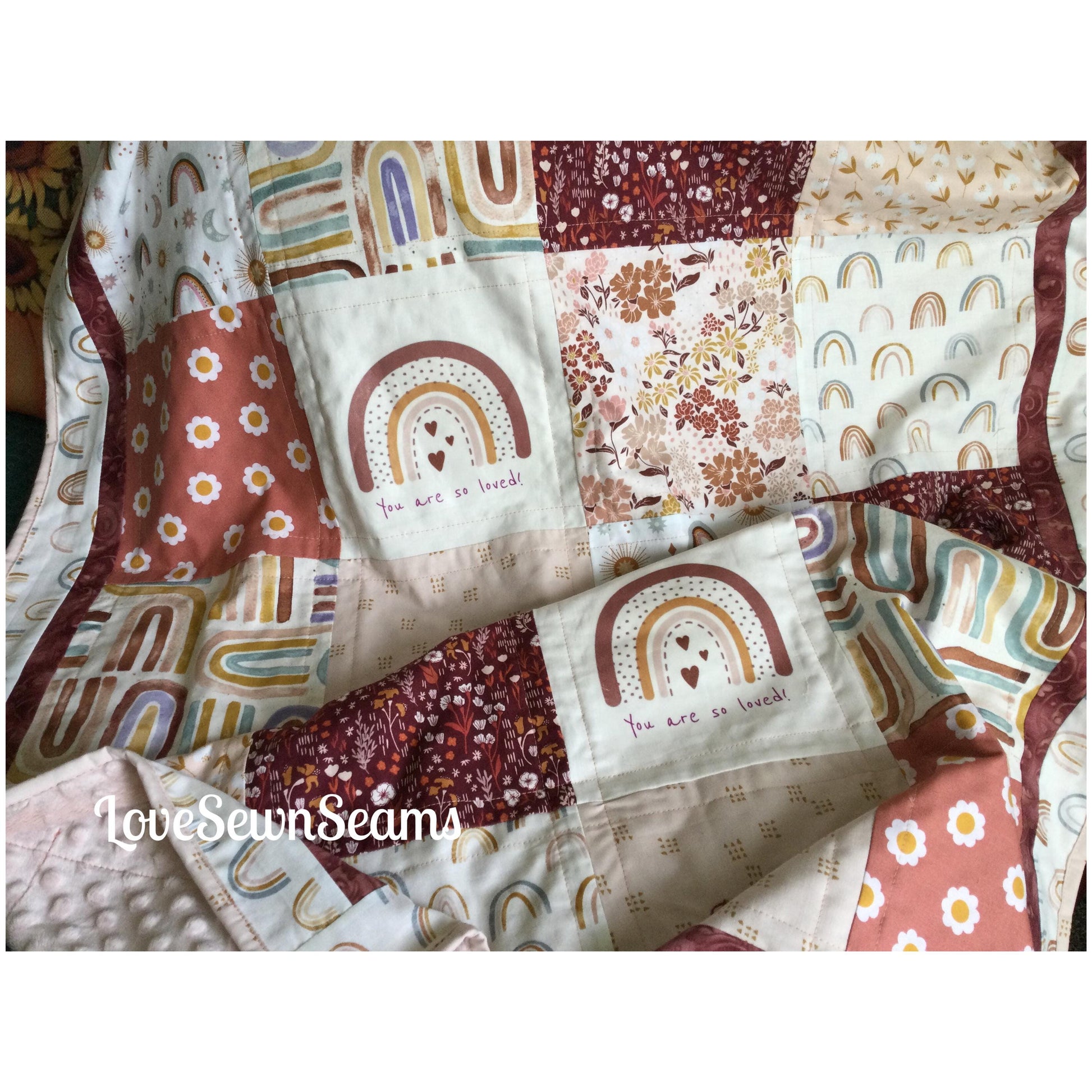 Beautiful Boho Rainbow quilt designed by LoveSewnSeams in shades of pink, plum, tea rose and golds. Handmade with the finest cottons and Minky. Several size options and you select the color of Minky for the reverse side (also cotton back option~message me for details)