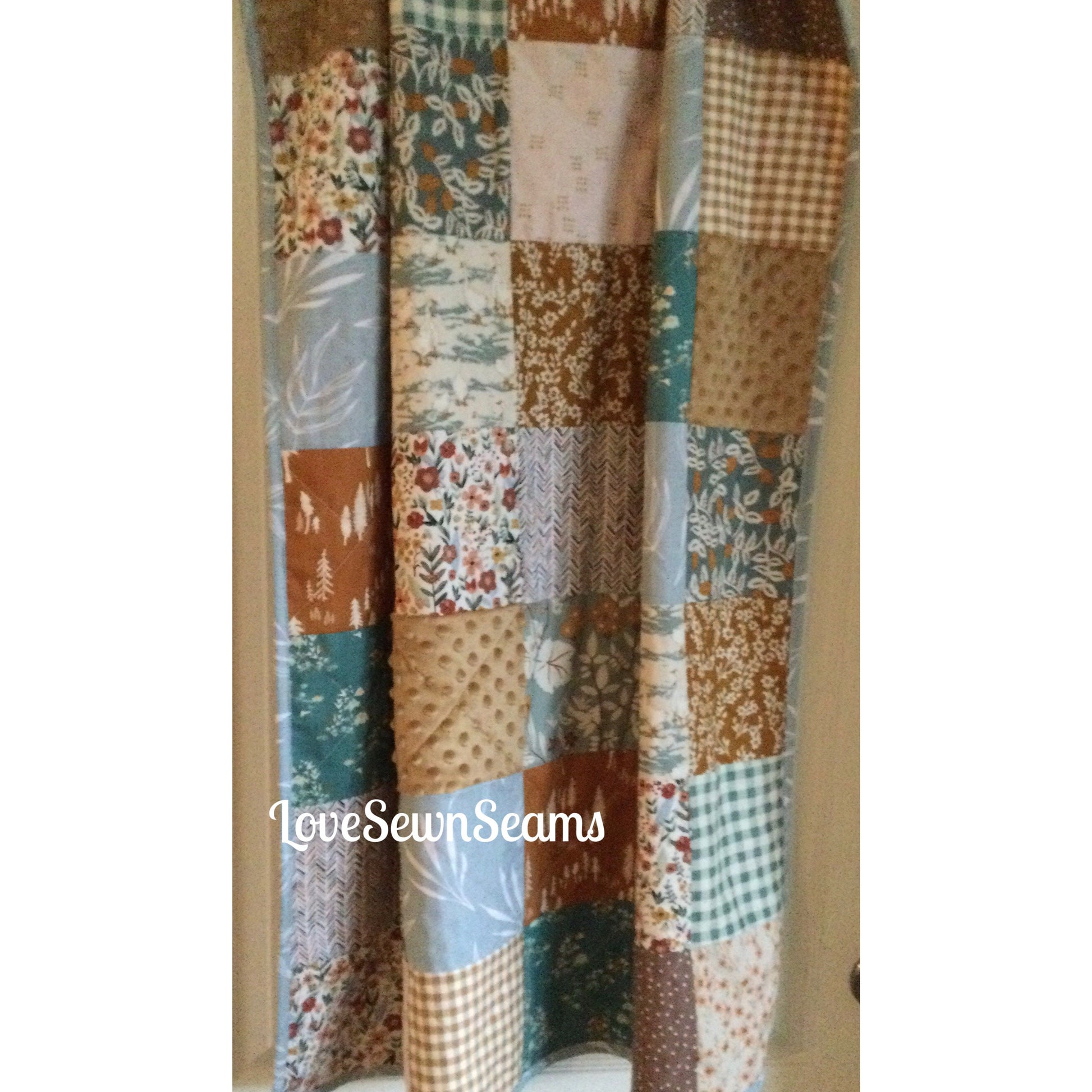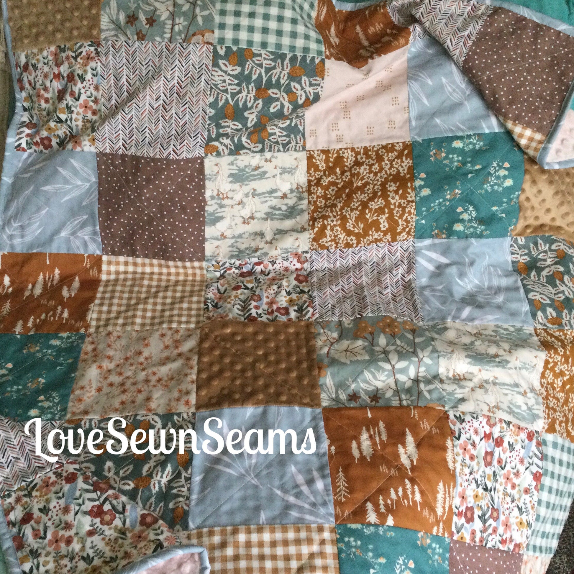 Wild Cottage~LoveSewnSeams exclusive design~Wild cottage patchwork quilt w soft n cuddly Minky on the reverse side. Beautifully selected designer cottons in earthy tones making the perfect crib quilt, throw or twin quilt. The reverse side is soft n cuddly Minky in your color choice.