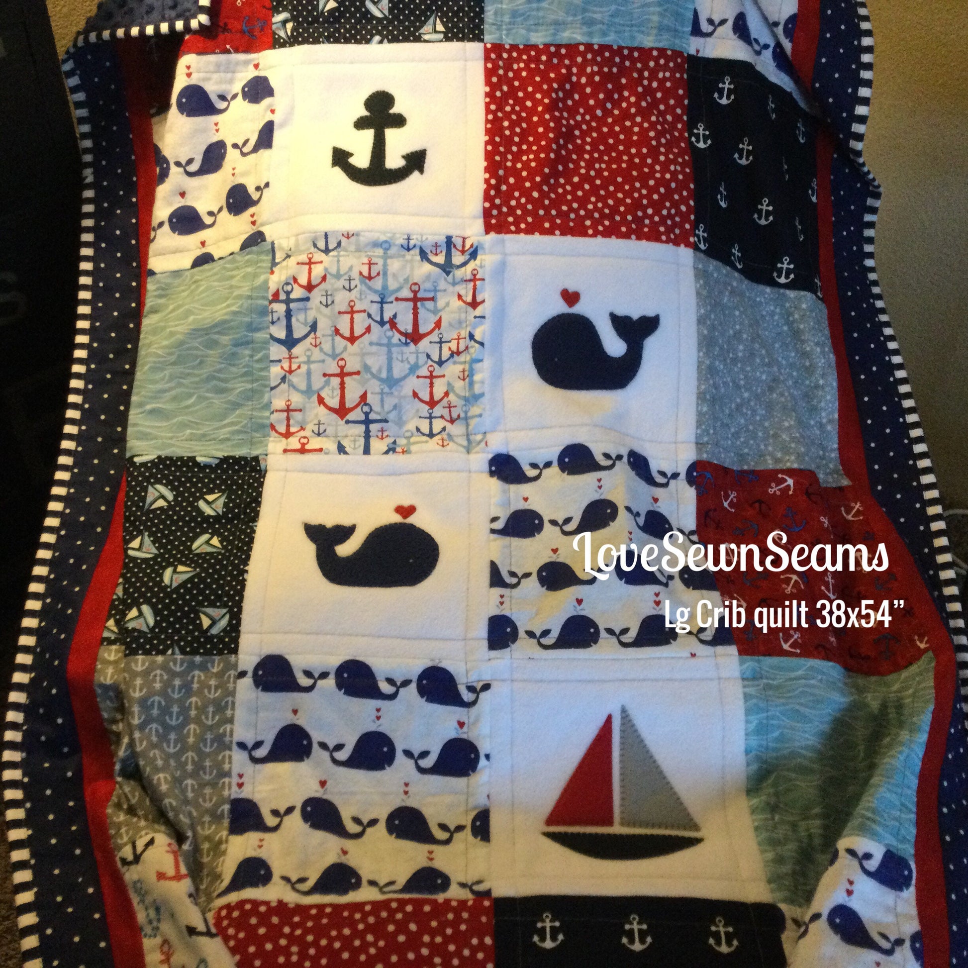Designed with a love of whales and the ocean. The 100% Cotton quilting fabrics in red, navy and white coordinate beautifully with the custom appliqués of whales, anchor and sailboat.