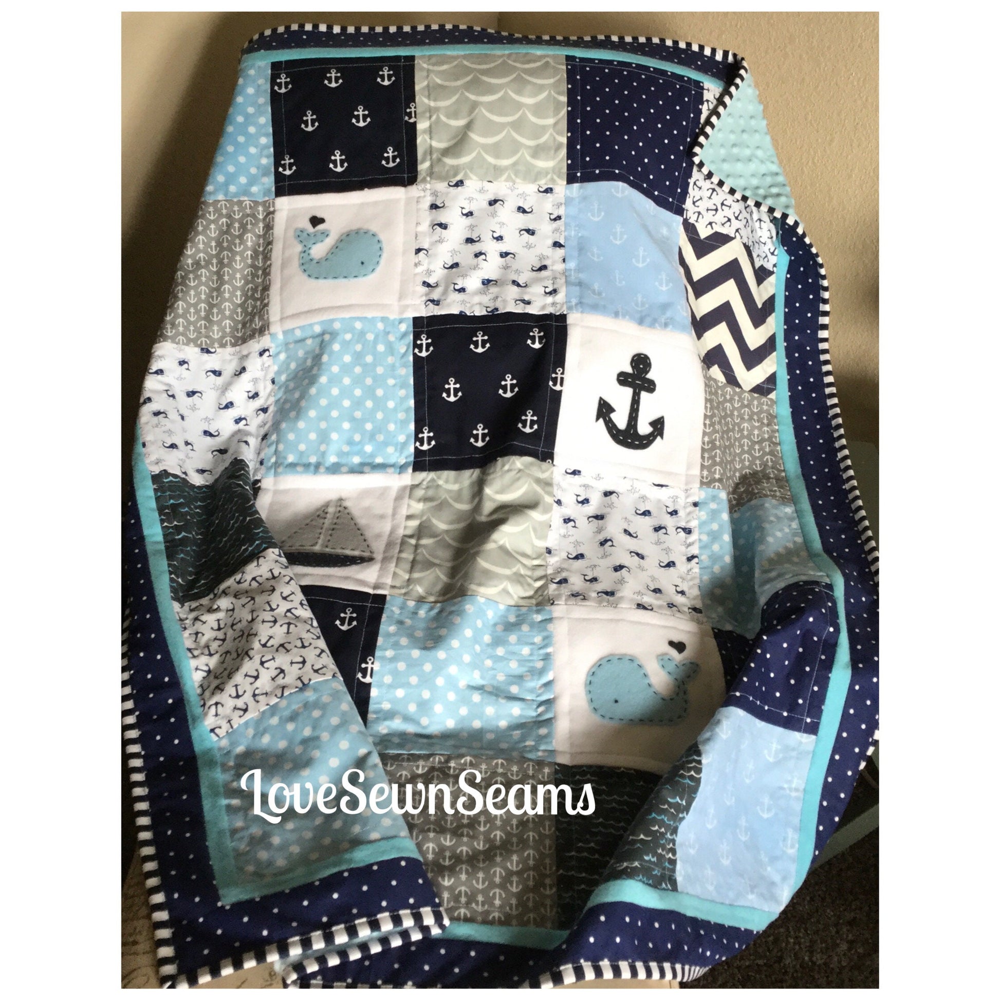 This quilt is Lovesewnseams exclusive and signature style quilt. Designed,from my love of the ocean. The 100% Designer Cotton quilting fabrics in navy, Light blue p, gray and white coordinate beautifully with the original designed nautical appliqués; Whales, sailboat and anchor